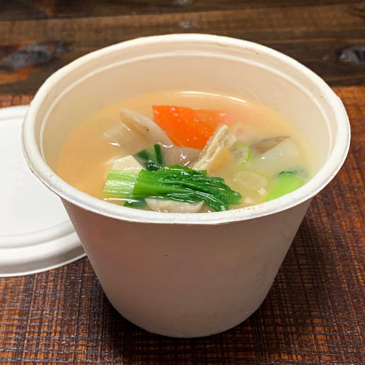 大根、人参、ゴボウ、しめじなどがたっぷり入った出汁のきいたお味噌汁です。