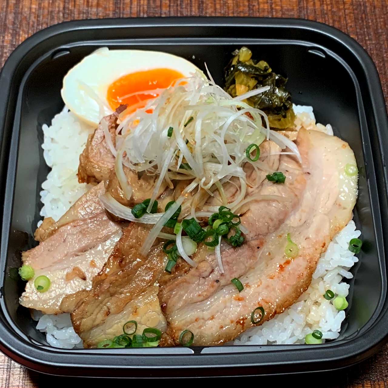備長炭で炙った自家製の国産豚バラチャーシューと味玉、野沢菜炒め、白髪ネギの組み合わせが絶妙な、当店の看板メニューです。
