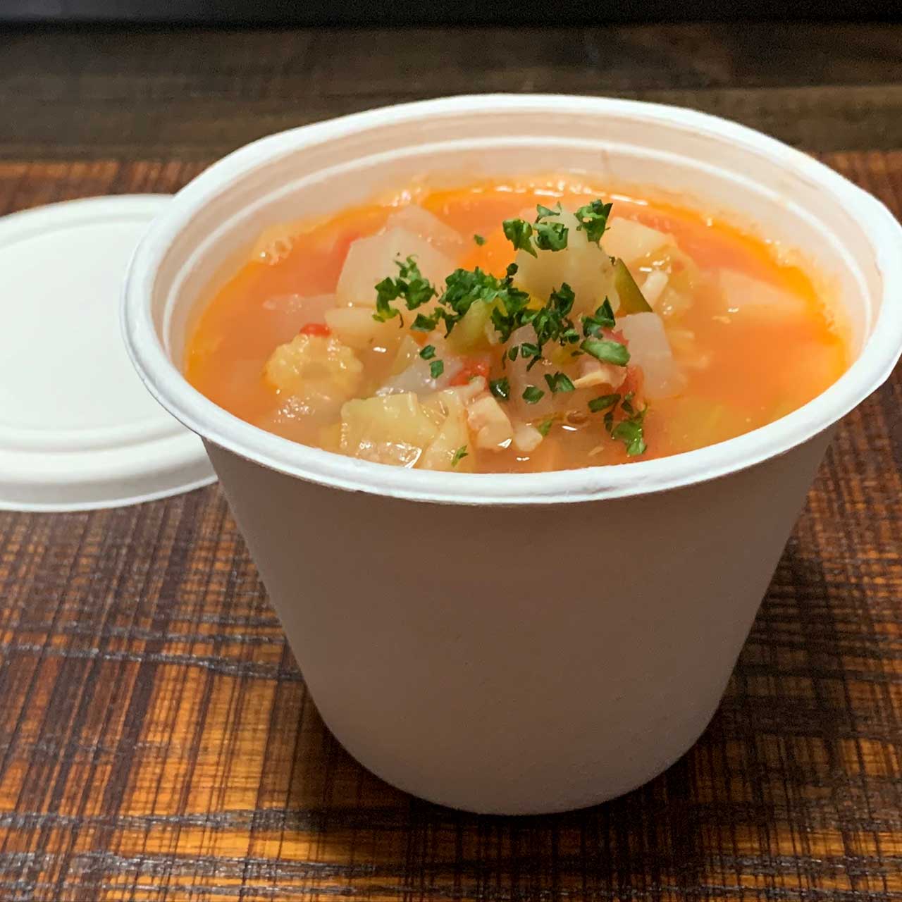 8〜10種類の野菜と豆をトマト味で煮込んだミネストローネ風のスープです。
