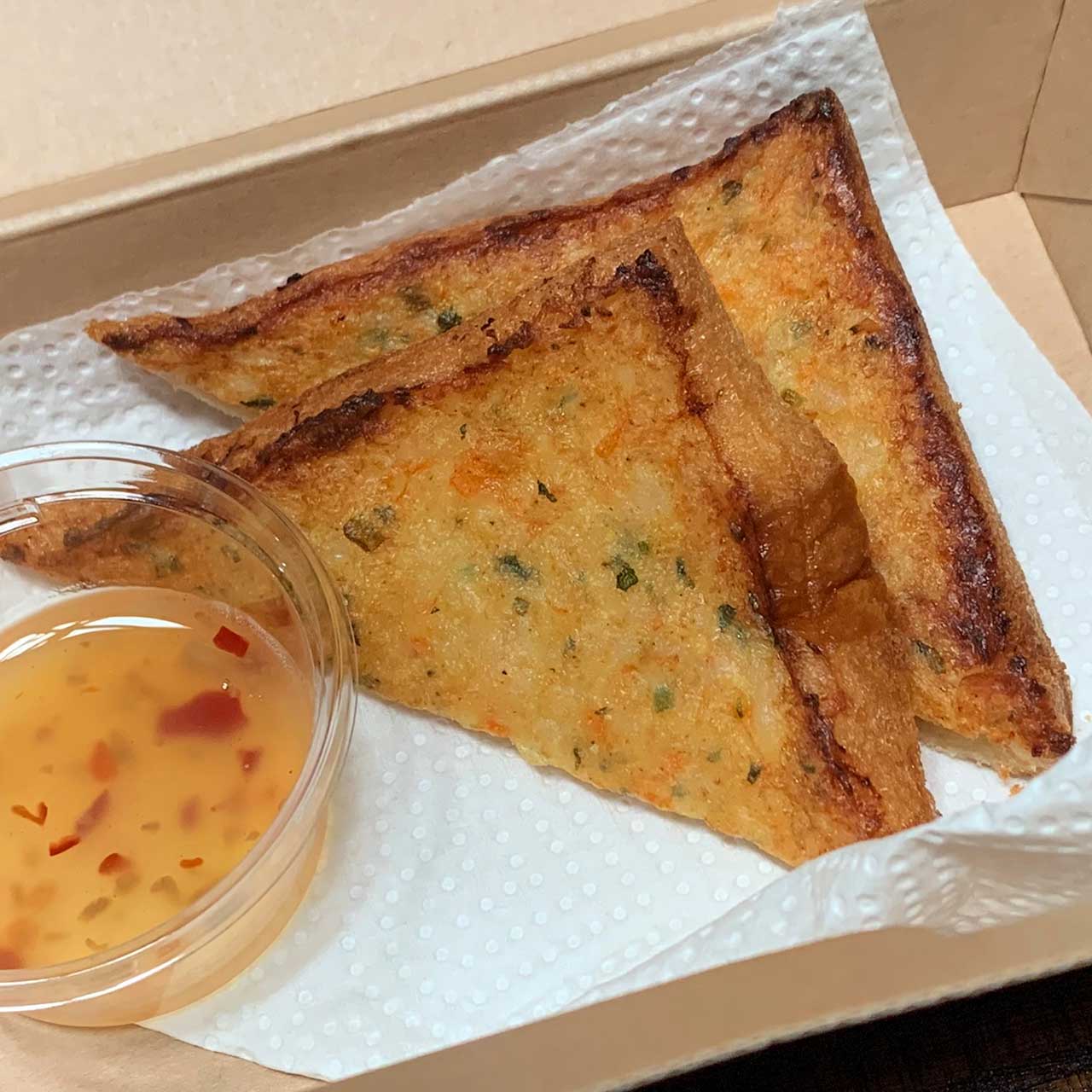 えびのすり身をパンに塗り、油で揚げてからオーブンでカリッと焼き上げました。