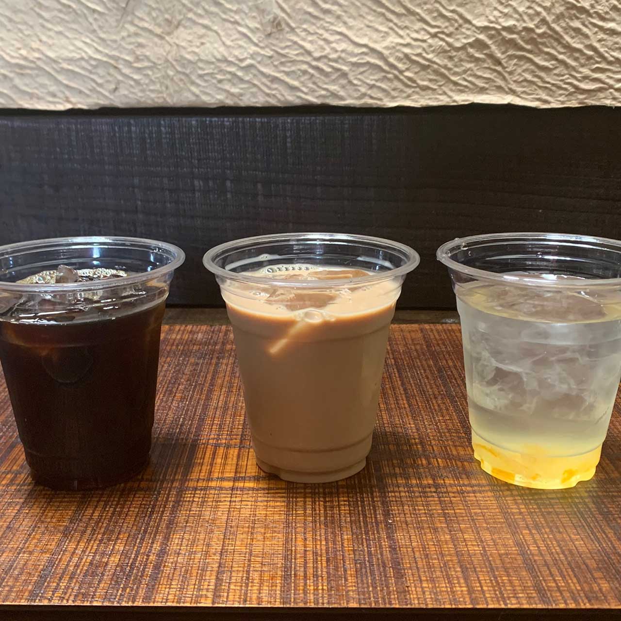 自家焙煎コーヒー夢豆さんのイタリアンブレンドを使用したアイスコーヒーとアイスカフェオレ。アイスゆず茶。